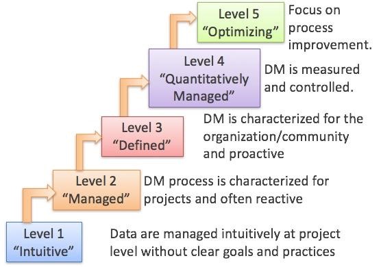 Results: The RDM CMM includes five chapters describing five key process areas for research data management: 1) data management in general; 2) data acquisition, processing, and quality assurance; 3) data description and representation; 4) data dissemination; and 5) repository services and preservation. In each chapter, key data management practices are organized into four groups according to the CMM’s generic processes: commitment to perform, ability to perform, tasks performed, and process assessment (combining the original measurement and verification). For each area of practice, the document provides a rubric to help projects or organizations assess their level of maturity in RDM.