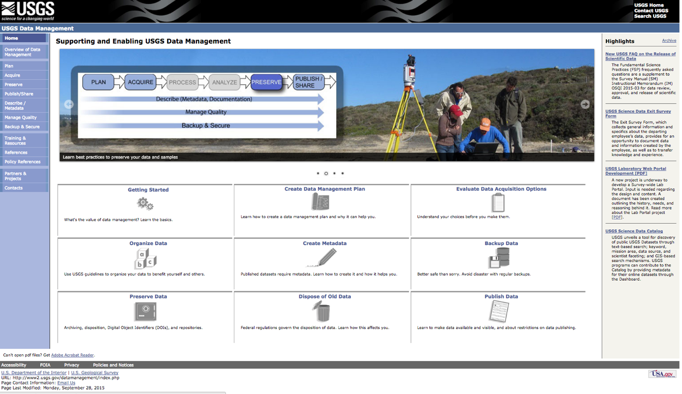 The Model serves as a critical framework for data management policy, instructional resources, and tools. The Model helps the USGS address both the Office of Science and Technology Policy (OSTP)2 for increased public access to federally funded research, and the Office of Management and Budget (OMB)3 2013 Open Data directives, as the foundation for a series of agency policies related to data management planning, metadata development, data release procedures, and the long-term preservation of data. Additionally, the agency website devoted to data management instruction and best practices (www2.usgs.gov/datamanagement) is designed around the Model’s structure and concepts. This paper also illustrates how the Model is being used to develop tools for supporting USGS research and data management processes.