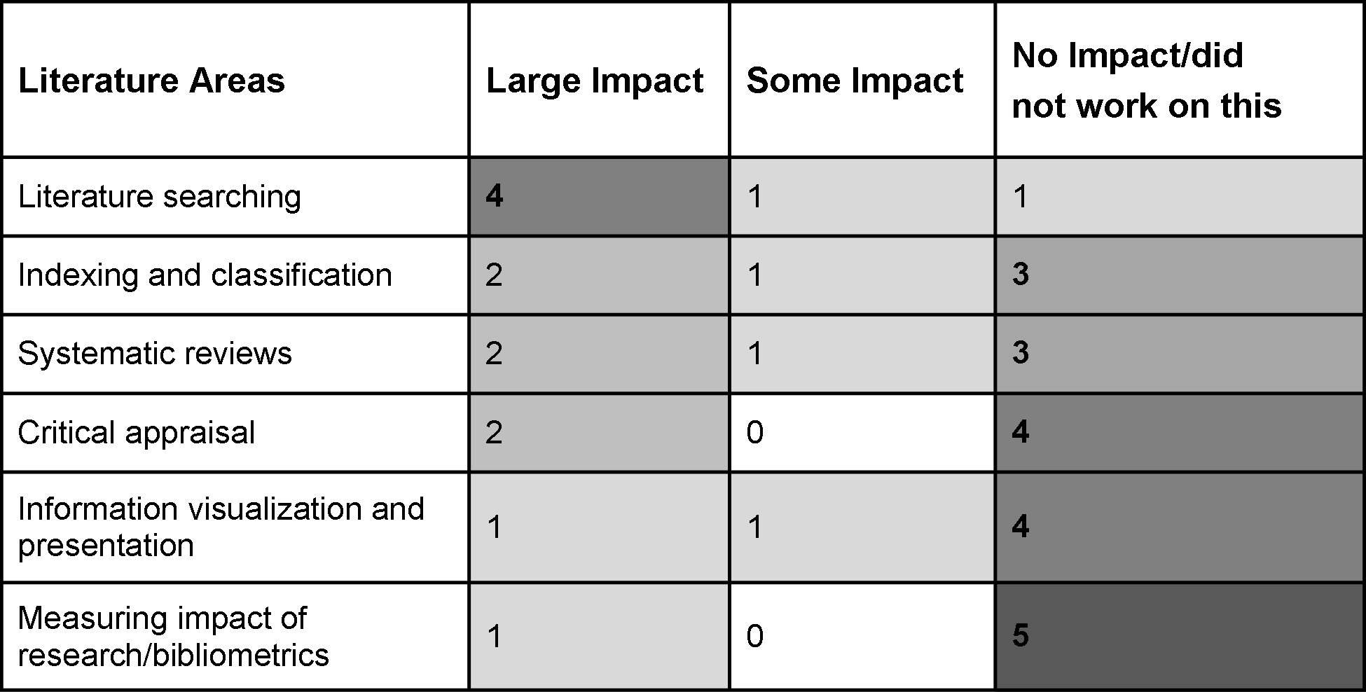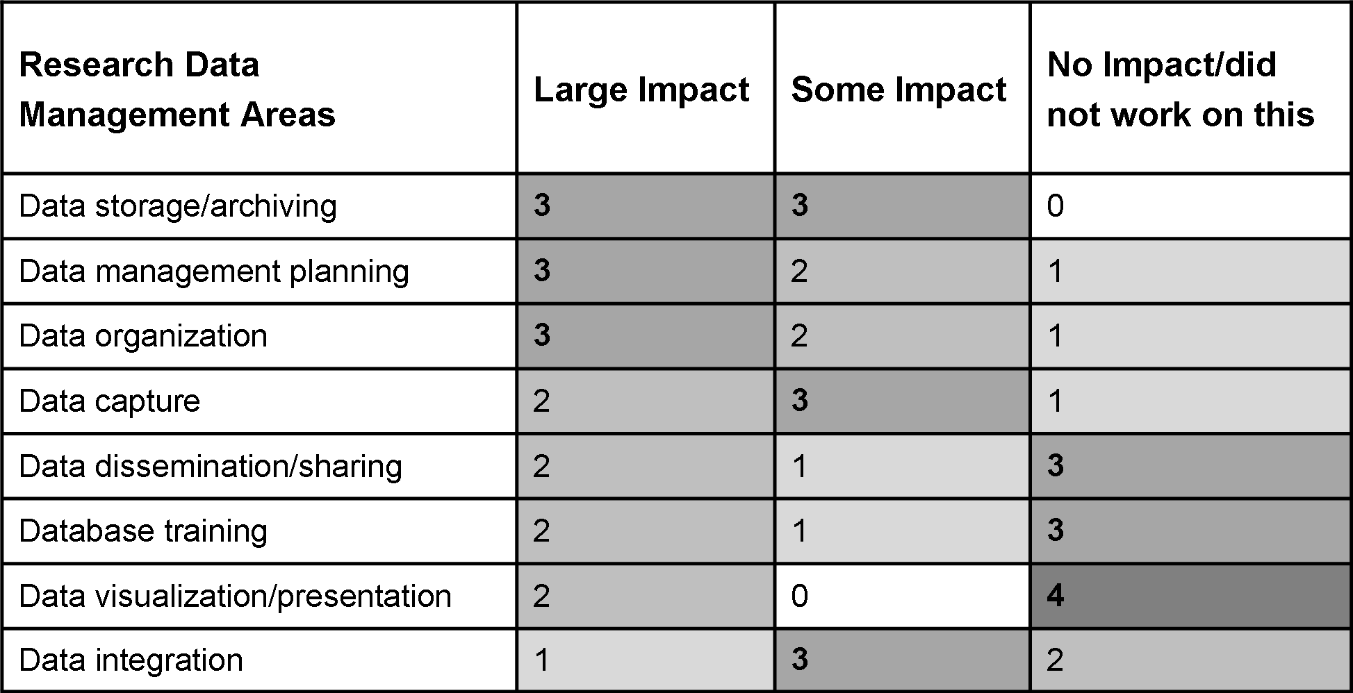Results: Informationists appeared to have a positive impact on their team’s research, especially in the areas of data storage, data management planning, data organization, and literature searching. In addition, many informationists felt that their involvement increased their research skills and made them true research partners. Assessing their own impact was a challenge for the award recipients, and questions remain about the best evaluation methods. The overall experience of the informationists and researchers was mixed but largely positive.