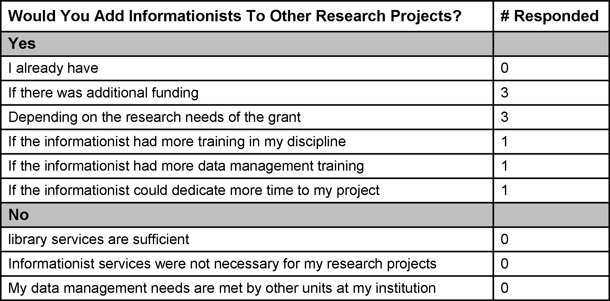 Methods: A mixed methods approach consisting of a survey of principal investigators and a focus group of informationists.