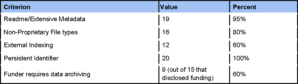 Methods: Using Thomson Reuters’ Data Citation Index and repository download statistics, we identified twenty cited/downloaded datasets. We documented the characteristics of the cited/downloaded datasets and their corresponding repositories in a self-designed rubric. The rubric includes six major categories: basic information; funding agency and journal information; linking and sharing; factors to encourage reuse; repository characteristics; and data description.