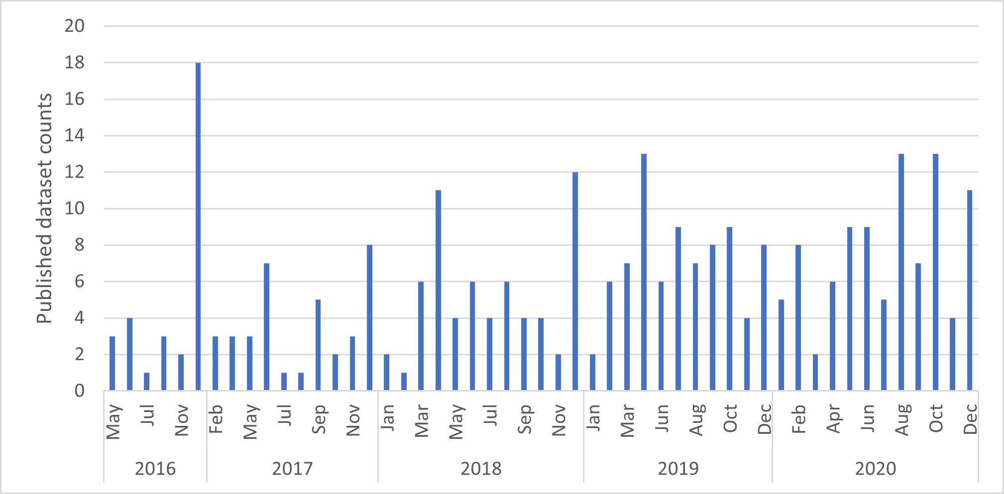 Methods: Some Illinois Data Bank metrics are collected internally by within the system, but most of the curation metrics reported here are tracked separately in a Google spreadsheet. The curator logs required information after curation is complete for each dataset. While the data is sometimes ambiguous (e.g., depending on researcher uptake of suggested actions), our curation data provide a general understanding about our data repository and have been useful in assessing our workflows and services. These metrics also help prioritize development needs for the Illinois Data Bank.