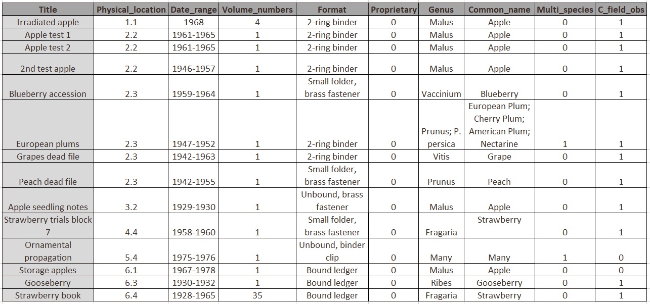 Methods: We worked in conjunction with researchers to inventory, describe, and increase access to a large, 100-year-old data set of analog fruit breeding data. This involved creating a spreadsheet to capture metadata about each data set, identifying data sets at risk for loss, and digitizing select items for deposit in our institutional repository.