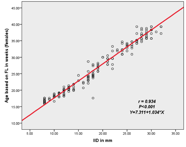 Ultrasound is an integral part of obstetric practice, and assessment of gestational age (GA) is a central element of obstetric ultrasonography. Sonographic estimation of GA is derived from calculations based on fetal measurements. Numerous equations for GA calculation from fetal biometry have been adopted in routine practice. This study reports a new method of estimating GA in the second and third trimester using interischial distance (IID), the distance between the two ischial primary ossification centers, on fetal ultrasound. Four hundred women with uncomplicated normal singleton pregnancies from 16 weeks to term were examined. Standard fetal obstetric ultrasound was done measuring biparietal diameter (BPD) and femur length (FL) for each fetus. The IID, in millimeters, was correlated with the GA in weeks based upon the BPD and FL individually, and the BPD and FL together. Statistical analysis showed strong correlation between the IID and GA calculated from the FL with correlation coefficient (r =0.989, P < 0.001). Strong linear correlation was also found between the IID and GA based upon BPD and BPD+FL. Further statistical analysis using regression equations also showed that the IID was slightly wider in female fetuses, but this difference was not statistically significant. Resulting from this analysis, we have arrived at an easy-to-use equation: GA Weeks = (IID mm + 8) ±1 week. We feel this method can be especially applicable in the developing world, where midwives may not have access to software for fetal biometry in their basic handheld ultrasound machines. Even more sophisticated machines may not come with loaded software for obstetrics analysis. There are several limitations to this study, discussed below. We recommend further studies correlating the IID with other biometric parameters.