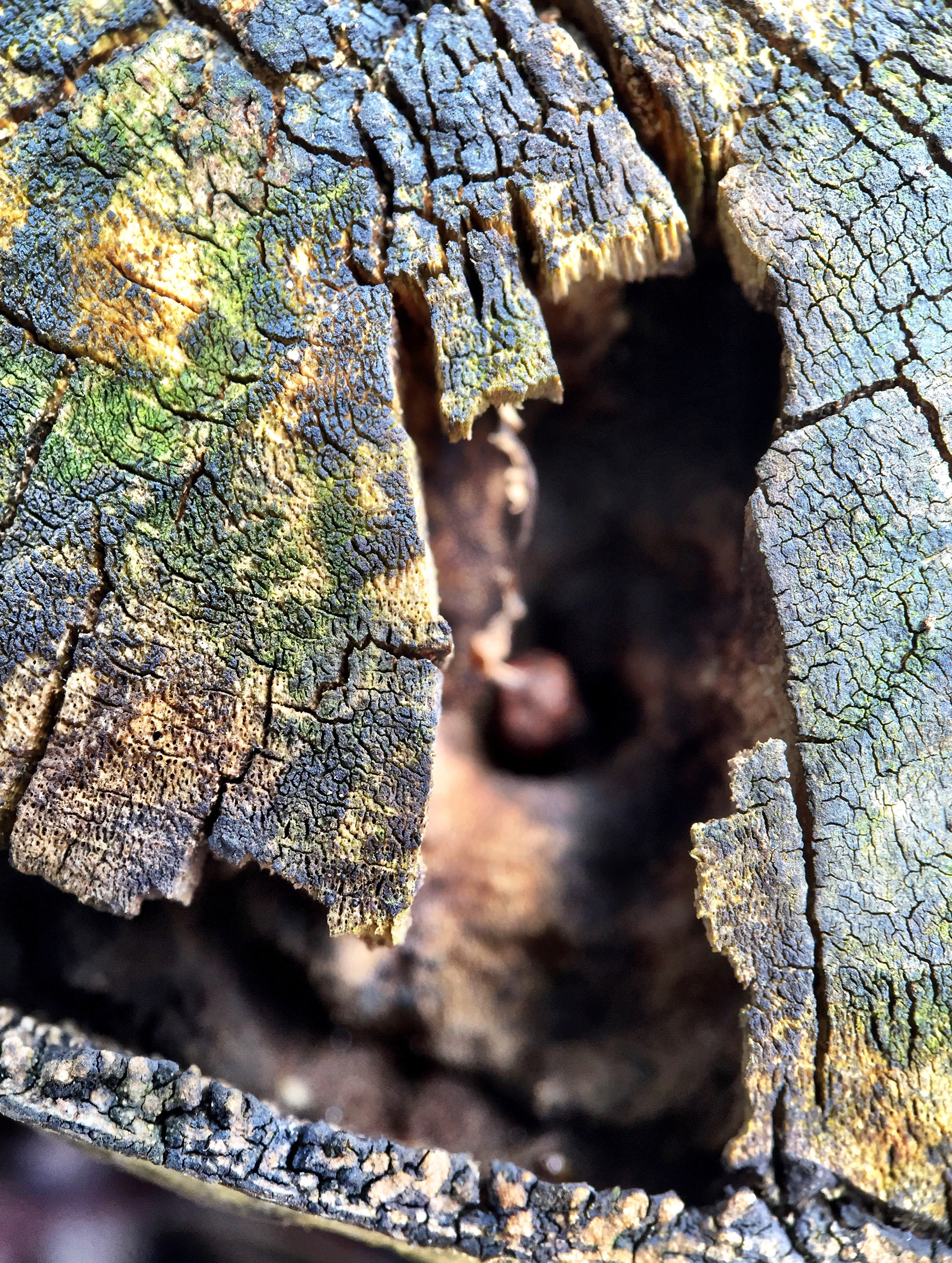 Wood, looking in: noted on a dog walk in the woods behind my house. Another world deep in a broken tree trunk.